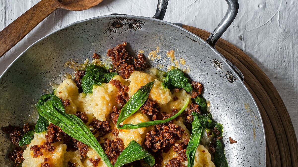 Zeit für leichte, frische Gerichte, die nach den langen Wintermonaten Lust auf Natur und neue Aromen machen. Nocken gibt es in der Region schon lange: von den rustikalen Holzknechtnocken aus Mehl und Schmalz bis hin zu dieser feinen Variante, die besonders gut zu kalt-nebeligen Frühlingstagen passt. Lukas Nagl verfeinert die Butternockerl mit einem Pesto aus jungem Bärlauch und altem Brot – ein Gericht, das er gerne privat für Freunde und Familie zubereitet und das wir nun mit Ihnen teilen möchten.