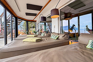 - Spacious relaxation area with waterbeds and lake view, with direct lake access and bathing jetty